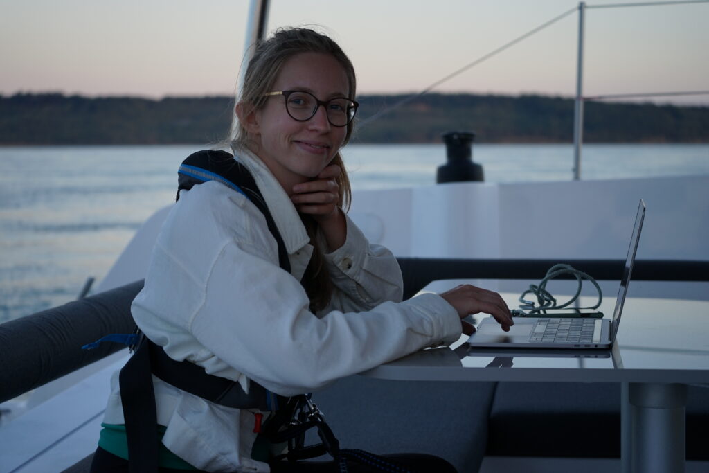 The furling process is very interesting. As these types of Gennakers are quite new, we did not actually know beforehand how they work, and we were quite surprised by it. For a normal headsail, the luff of the sail (that is the forward-facing edge of the sail) is attached to the forestay, the metal wire which connects the mast with the bow of the ship. With a typical furling system, you put a plastic pipe around the forestay that is free to rotate and attach the luff to the pipe. On the bottom, you have a line that starts rotating this pipe and makes the sail furle around it. With our system, there is no such rigid pipe. What we have is an elastic rope that goes through the luff of the sail. When we start furling it up, we don’t let go of the sheet. The elastic rope starts to twist, but since it is not directly connected to the sail, nothing happens. You continue to turn the furler, until the elastic rope is under a lot of tension and you can’t turn it anymore, and then you let go of the sheet. All the stored energy in that rope is released at once, and the sail starts wildly to furl from top to bottom. After about one second, most of the sail is furled up and with only a little more twisting we can furl it away fully. This method of top-down furling is apparently much safer for downwind sails than the traditional ones.